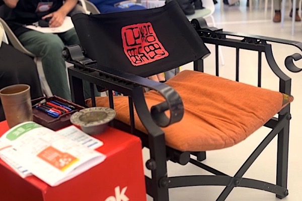 校長・松岡正剛の椅子。愛用の灰皿とVコーンが、当日のプログラムと共に脇のテーブルに置かれている。
