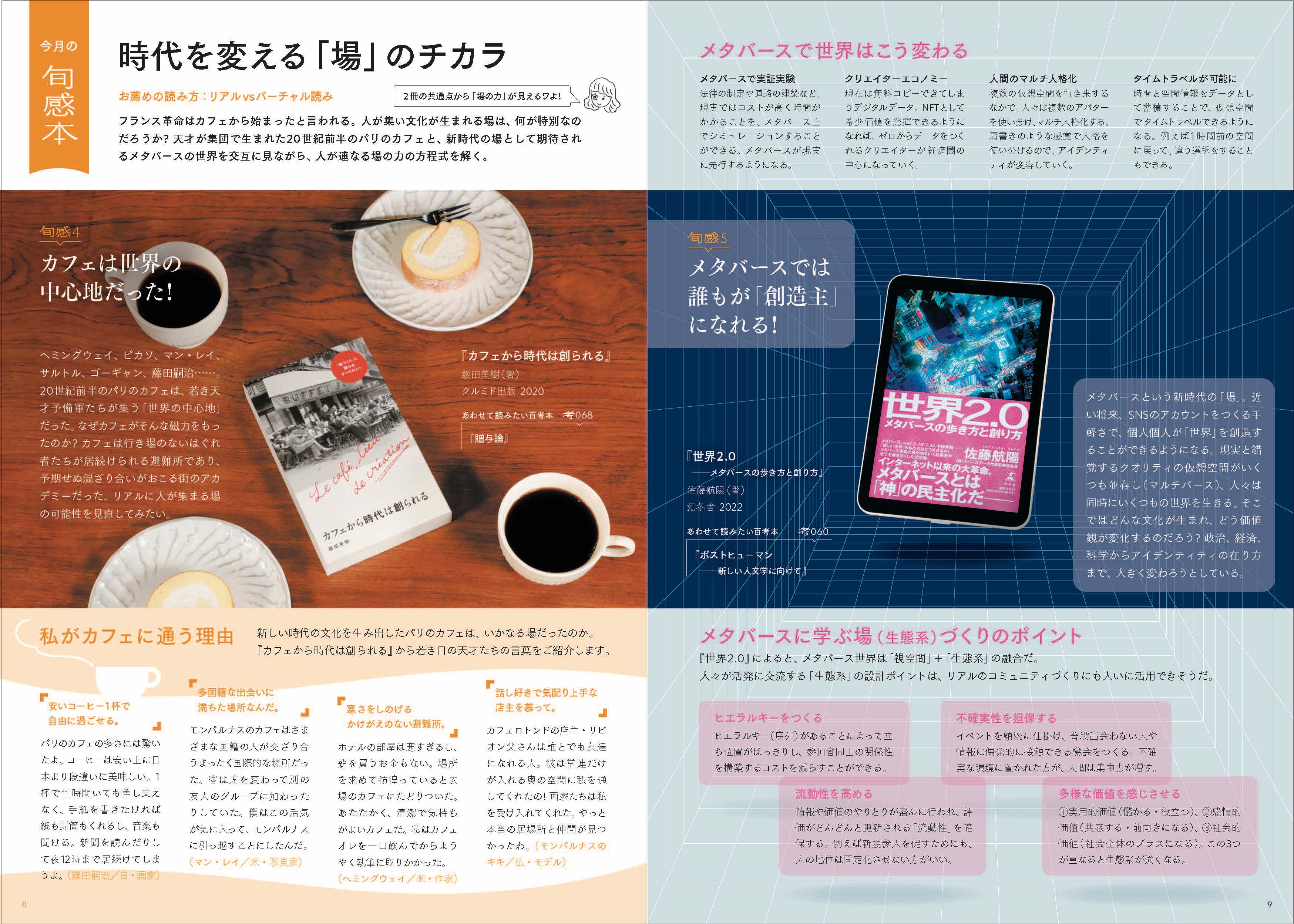 2023年6月の「ほんのれん」旬感本では「場にはどんな力がある?」をテーマに、近代ヨーロッパの時代を作ったカフェや,これからの可能性が期待されるメタバースという様々な「場」の力をとりあげた。画像は「旬感ノート」の1ページ。