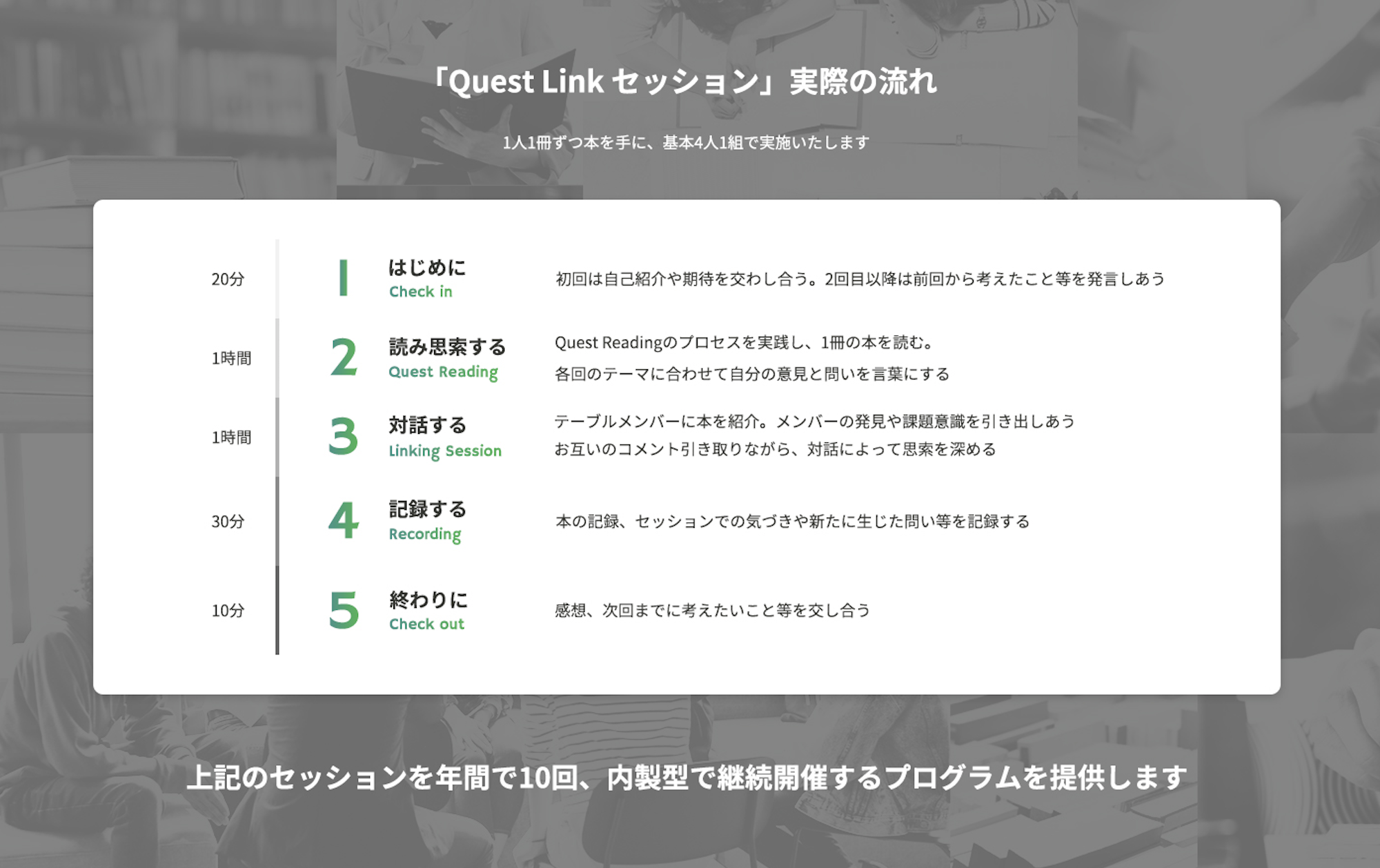 1回の「Quest Link セッション」は通常3時間、12名以上を推奨しています。探究型読書=Quest Readingを行い、共読=Linking Sessionで対話を深め、気づきの記録=Recording を行います。