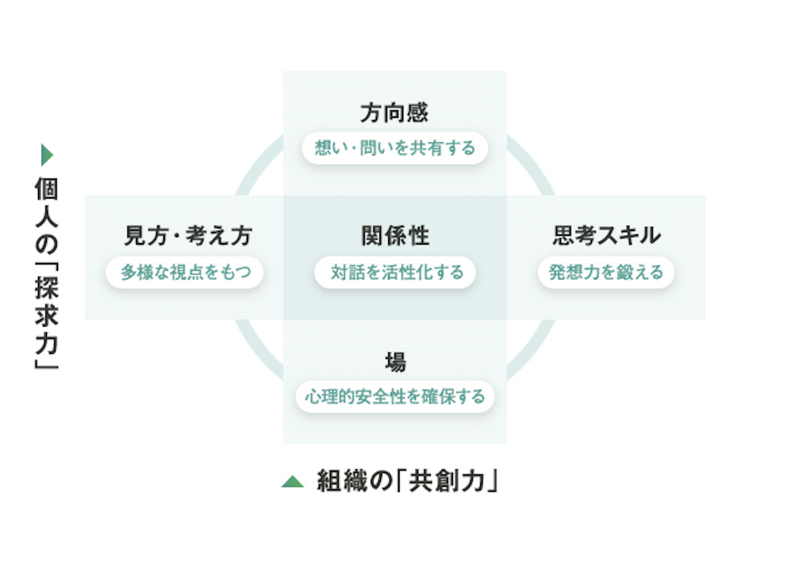 社員ひとりひとりが与えられた枠組みにとどまらず、自ら問いを立て続ける力(探究力)をどう身につけるのか。組織がイノベーション体質になるために分野や業務を超え共に新たな価値を創り出していく力(共創力)をいかに高めていくのか。
