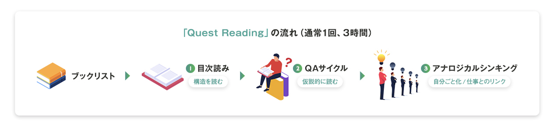 「Quest Link」は、これらを同時に向上させるためのコアメソッドとして、個と集団の探求力・共創力を引き出す読書法「探究型読書:Quest Reading」を実践いたします。