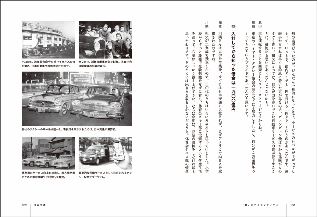 日本交通 「モビリティの未来に羽ばたくプライド」より(p108) 各社のヒストリーを切り取った写真を掲載している。