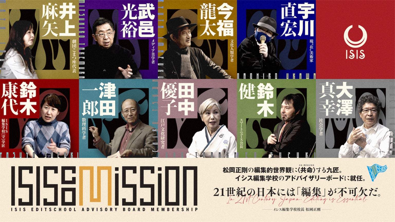 イシス編集学校は、インターネット上で「編集術」を学べる学校として2000年に開校しました。10代から80代まで、さまざまな学び手が正解のない問いに向かう方法を学び続けています。2024年からは各界の有識者9人がアドバイザリーボード・メンバー「ISIS co-mission」として参加し、学校の運営や活動に協力・助言しています。