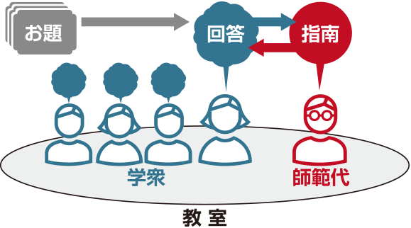 イシス編集学校では、「師範代」と呼ばれる編集コーチと10名程度の年齢や職業も居住地域も様々な学習者がインターネット上の教室に集まります。師範代と学習者の間で、テキストでの出題・回答・指南が対話的に交わされながら進んでいく学習スタイルです。学習者は同じ教室の学習者の回答と指南を見て、違う視点を見つけたり、自分では気づかなかった思考のクセに気づいたりしながら、情報編集のための方法を学んでいきます。師範代と学習者、学習者同士が互いに呼応して、自主的に学びを深めていくようになるのです。