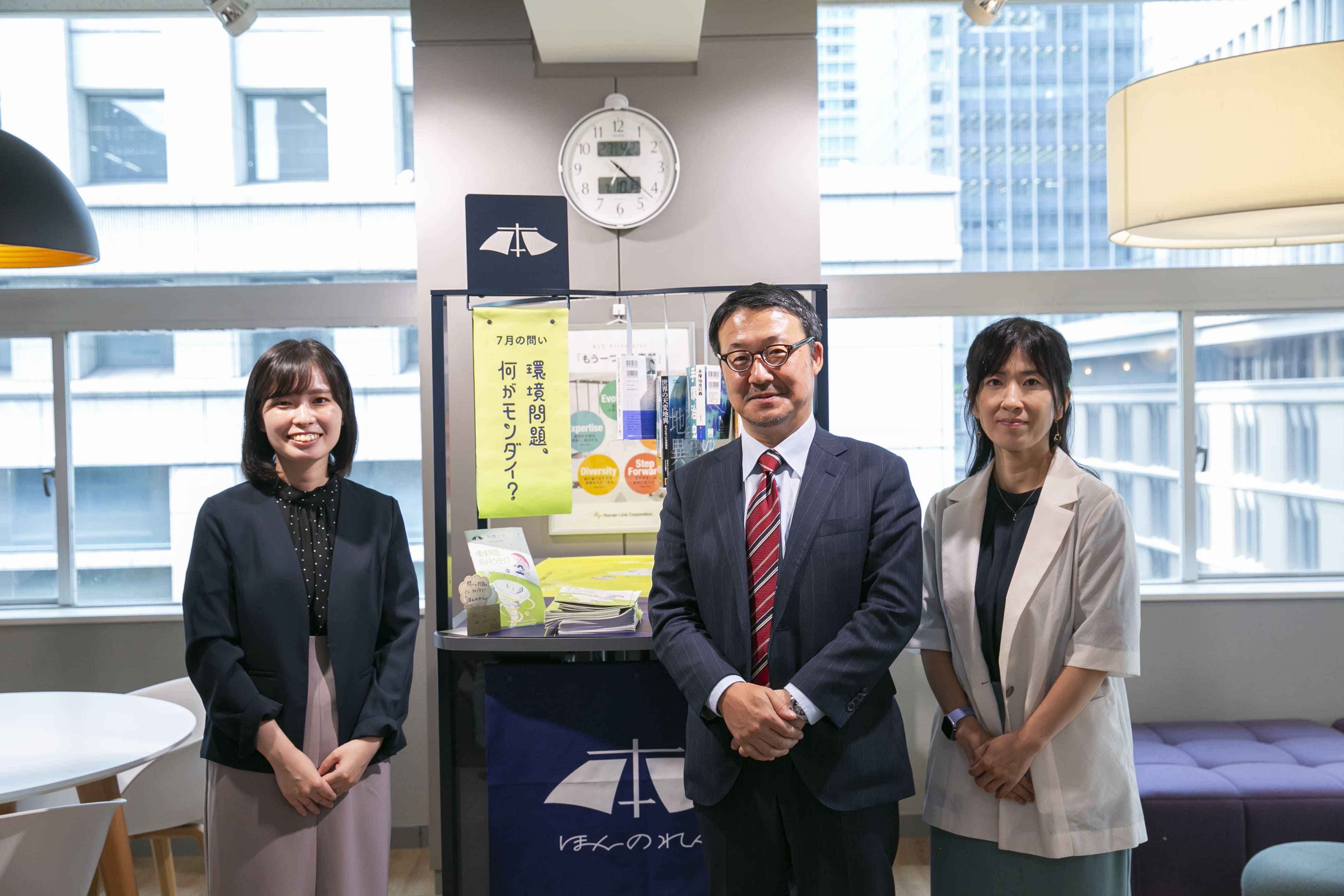 渡邉さん「ほんのれん棚のテーブルは、囲んで対面で雑談するのに良い距離感です」。寺田さん「たまたま手に取ったこの本。パラパラめくっただけですが、環境問題を考えるという問いがあるからか、不思議と持ち帰って読みたくなります」。