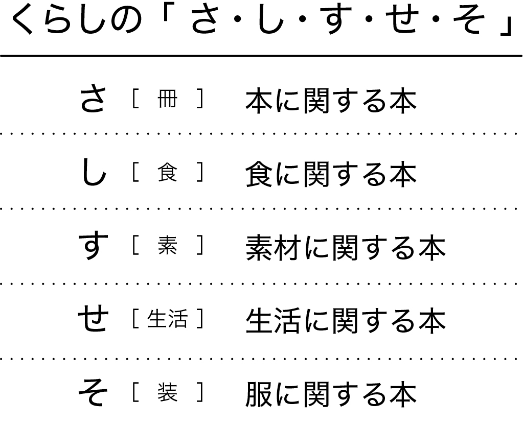 無印良品の店内にショップ・イン・ショップを設計。無印良品が大事にする「感じ良いくらし」をお客様に伝えるために、「ずっといい言葉」とともに本のあるくらしを提案する「MUJI BOOKS」を、全国20店舗以上で展開しています。台湾、上海、香港などにも展開中。 Research 調査・分析 無印良品のコンセプトについて、社内外の各種資料や関係者への取材を通して、その背景にある価値観や世界観を分析しました。 Concept Make コンセプト設計 「感じ良いくらし」の背景にあるキーコンセプトとして「素」を想定し、そこから「くらしの“さ・し・す・せ・そ”」というコンセプトを構築。書棚の分類・見出しとして展開しました。